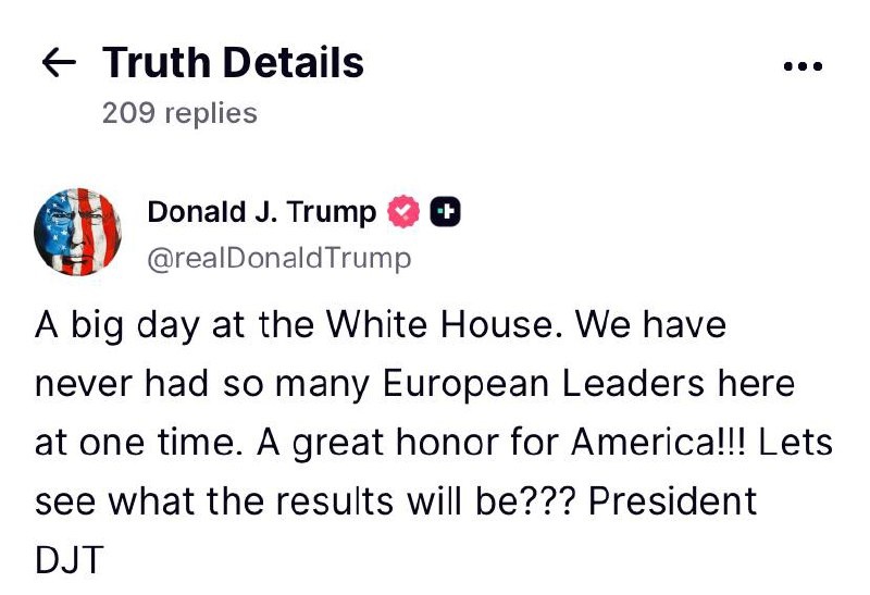 Трамп анонсировал «важный день в Белом доме»: «У нас тут никогда не было столько европейских лидеров одновременно. Это большая честь для Америки!!! Давайте посмотрим, каковы будут результаты». 👍 БайБайден. Подписаться