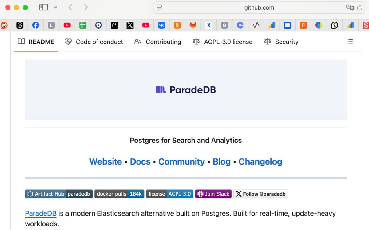 ParadeDB - модная замена Elasticsearch, только без лишней экзотики, потому что сделана на базе Postgres. Заточена под реальное время и нагрузку, где данные постоянно добавляются и обновляются. Уже готова в формате Docker-образа или Helm chart для Kubernetes. На GitHub у проекта 7.6 тысяч звезд, 266 форков, 70 контрибьюторов и 153 релиза, последний вышел всего пару недель назад. Код написан почти целиком на Rust (93 процента), остальное - немного PLpgSQL и всякой мелочи. У нас в проектах Manticore + Elastic вовсю используются и как мне кажется, первый чуть интереснее. Русский ИТ бизнес