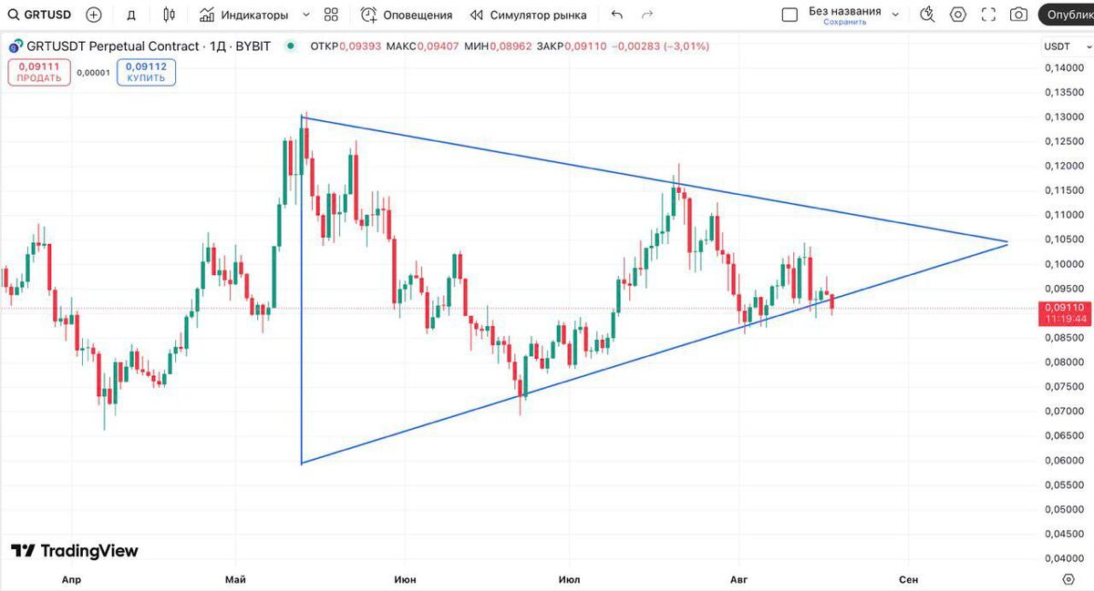 GRT (1д) Цена торгуется в пределах симметричного треугольника, если на дневке закрепимся внутри треугольника, то можно присмотреться к покупке актива в направлении лонг 💥