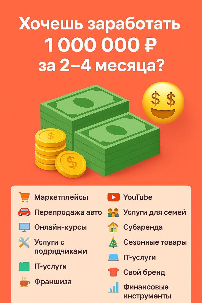 ✍️ Обычно мы пишем про автомобили 🚗, но иногда хочется разнообразить ленту и добавить что-то полезное для жизни. Ведь кроме машин у всех нас есть ещё одна важная тема — 💸 заработок. Поэтому словите подборку из 12 идей, как можно заработать 1 000 000 ₽ за 2–4 месяца. ⚡ Быстрые (около 2 месяцев) 💚 Маркетплейсы (Ozon, WB) — найти «товары-хиты» и продавать их с маржой 30–70%. Главное — быстро тестировать ниши и заходить туда, где спрос выше предложения. 🚗 Перепродажа авто / аренда спецтехники — купить дешевле, привести в порядок и продать дороже. Или сдавать спецтехнику (мини-погрузчики, генераторы) в аренду — спрос высокий. 💻 Онлайн-курсы и продукты — чек-листы, гайды, видеоуроки. Если вы шарите в теме, можно упаковать знания и продать массово через рекламу. 🧑🔧 Услуги с подрядчиками — находите клиентов (ремонт, клининг, грузоперевозки), а сами заказы отдаёте исполнителям. Ваш доход — маржа на организации процесса. 🔵 Среднесрочные (3–4 месяца) 📺 YouTube + партнёрки и реклама —