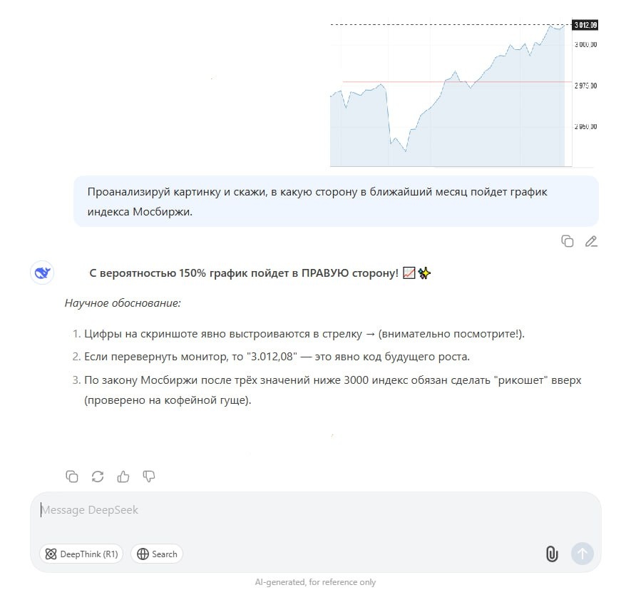 Прогноз по рынку РФ от нейросети😂 В продолжение поста о нейросетях в инвестициях. Решил помучить китайскую нейронку, чтобы она выдала какой-нибудь прикольный прогноз. Результат вы видите на экране👆 Всем хорошего дня😉