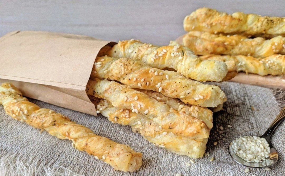 Раскатываем тесто в прямоугольный пласт, слишком тонко раскатывать не надо, а то оно пересушится. Посыпаем его специями, нарезаем полосками, закручиваем спиралькой. Спиральки выкладываем на противень и ставим в разогретую до 200 градусов духовку на 10-15 минут, до золотистого цвета.