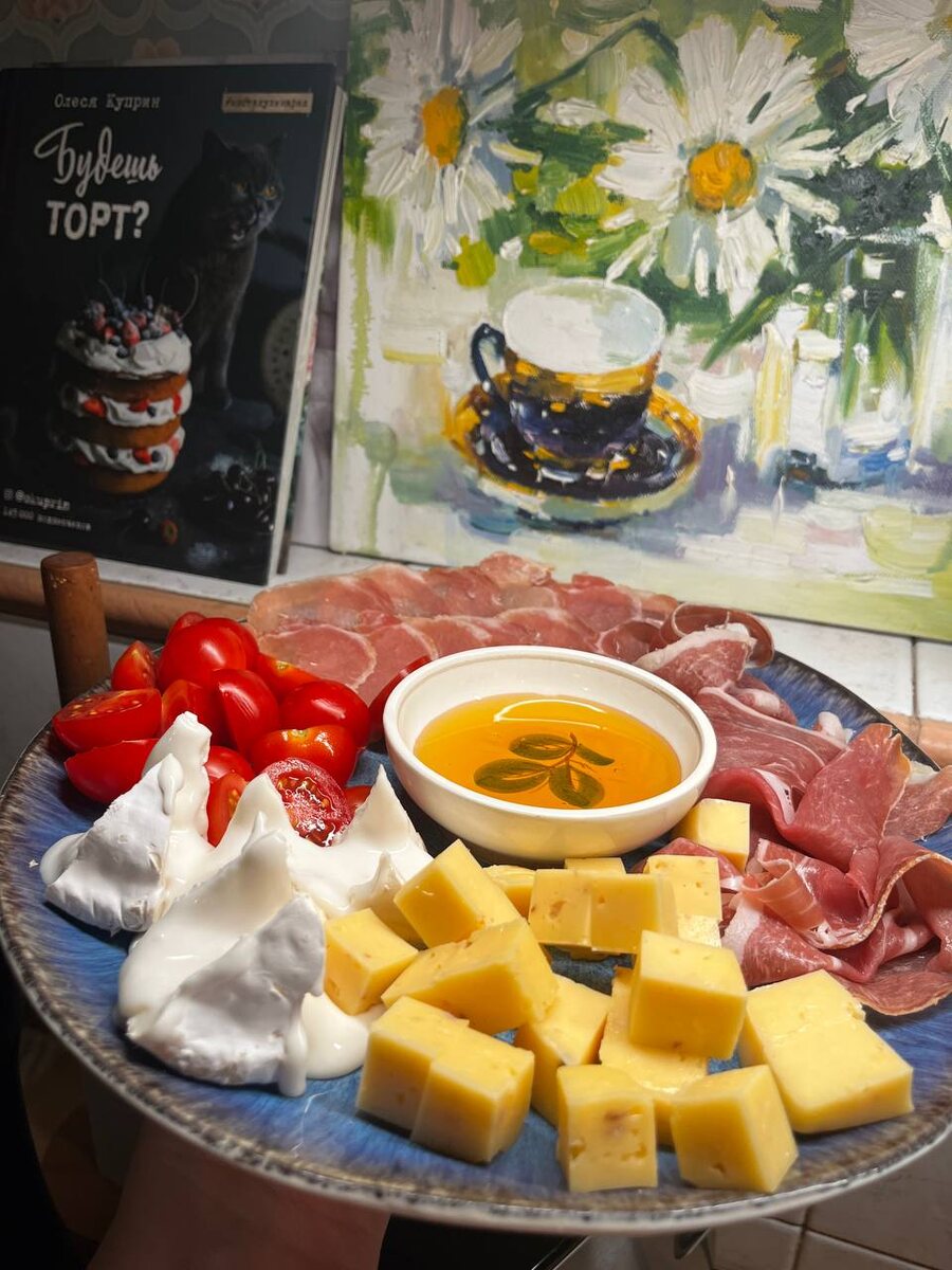 Бывает, что хочется чего-то вкусного, но при этом вы и сыты, и вроде на диете. В такие моменты выручает сырно-мясная тарелка — просто, быстро и очень атмосферно. Что можно положить: • черри — для свежести • мёд — жидкий, полупрозрачный (у меня горный мёд из «Перекрёстка», идеально тянется) • сыр с грецкими орехами «Ларец» • камамбер из козьего молока («Перекрёсток», нежный, не уступает европейскому) • мясная нарезка (у меня была из Европы, хранилась в морозилке до особого случая) Собирается такая тарелка за пару минут, а впечатление как в ресторане. Простейший ужин или закуска, которую можно приготовить без усилий. P.S. Нет, «Перекрёсток» мне за рекламу не платит, но я бы не отказалась :) ❤️ ❤️ ❤️ Забирай подборку >> по ссылке <<, с которой ты перестанешь тратить время у плиты🔥