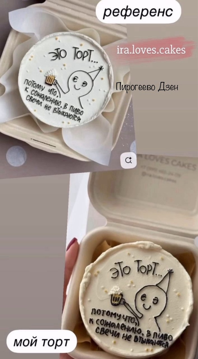 "Здравствуйте! Поделюсь грустным опытом. Не всегда попадаются заказчики адекватные. В этот раз мне попалась странная клиентка. Запрос торта был по следующему референсу, и я сделала такой торт: В качестве референса была работа из портфолио, снятая на профессиональный фотоаппарат. Об этом можно судить по обработке фото. Мой торт (на мой взгляд) ничем не уступает референсу, если как следует обработать фото, будет точь-в-точь. Но заказчица попросила вернуть предоплату, сказала, что торт забирать не будет. Якобы торт не соответствует тому, что она заказала. Есть ощущение, что она просто не смогла придумать хорошую отговорку, чтобы не забирать торт: передумали праздновать, срочно потребовались деньги или было что-то другое... И возникает вопрос: люди вообще понимают, что один в один никогда не получится, если кондитеры разные? Закажи там, где изначально взяла референс или будь готова к небольшим различиям. Каково ваше мнение?" ❓ #каквамторт? ❓ Как вы считаете, кондитер справилась с заданием