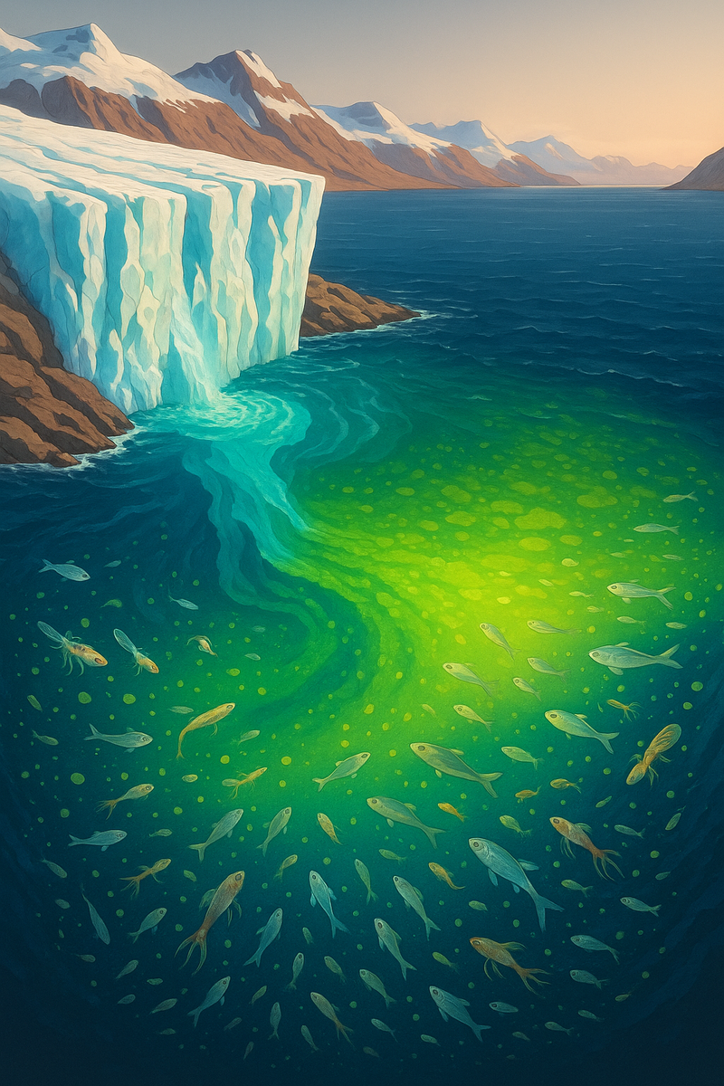 Западный ледник Якобсхавн в Гренландии теряет по меньшей мере 293 млрд тонн льда в год. Во время пикового таяния через его подлёдные трубы проходит более 300 000 галлонов пресной воды каждую секунду. Огромные реки швыряют кубики льда в фьорды, но талая вода не растворяется бесследно. Модели NASA показали: струя пресной воды поднимается к поверхности как фонтан, увлекая за собой глубокие слои, богатые железом и нитратами. Это напоминает миксер, который вбирает сок со дна стакана. Когда питательные вещества достигают солнечного света, они становятся пищей для фитопланктона — микроскопических водорослей, производящих половину кислорода планеты. Спутники показали, что количество фитопланктона в Арктике выросло на 57 % с 1998 по 2018 год. Модели ECCO‑Darwin демонстрируют, что такой подъём может увеличить летнее цветение вокруг ледника на 15–40 %. Процесс двоякий: талая вода ослабляет солёность и снижает способность океана растворять CO₂, но бурные вспышки фитопланктона поглощают этот газ.