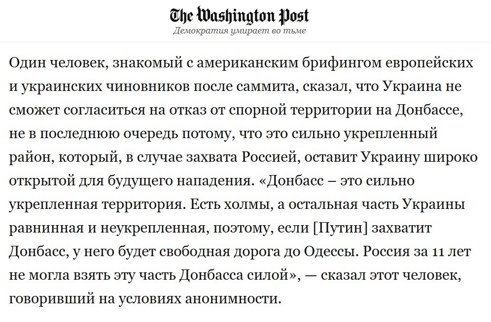 «Один человек, знакомый с американским брифингом европейских и украинских чиновников после саммита, сказал, что Украина не сможет согласиться на отказ от спорной территории на Донбассе, не в последнюю очередь потому, что это сильно укрепленный район, который, в случае захвата Россией, оставит Украину широко открытой для будущего нападения. Донбасс – это сильно укрепленная территория. Есть холмы, а остальная часть Украины равнинная и неукрепленная. Поэтому, если Зеленский сдаст Донбасс, то он откроет свободн