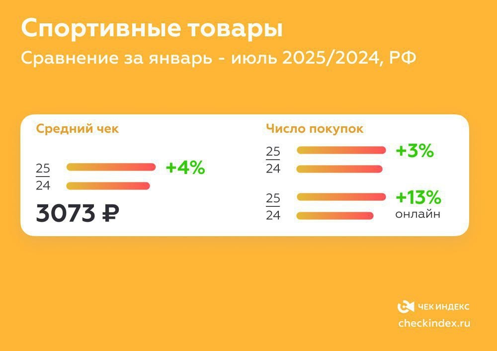 🎾 И опять на спорте Пока россияне качают мышцы, спортивные ритейлеры и фитнес-центры выкачивают деньги из их кошельков: траты на спортивные товары растут. За январь–июль 2025 года в сегменте спортивных товаров средний чек вырос на 4% год к году до 3073 рублей. Покупок стало больше на 3%, а в онлайне - так вообще +13% (данные "Чек Индекс"). У фитнес-услуг средний чек показал +10% и 4055 руб. (+10%). А желающих потренироваться стало на 5% больше. Что берут чаще всего? - Одежда и обувь: футболки, кроссовки, шорты. - Домашние тренировки: коврики, гантели, фитнес-резинки. - Спортивные игры: мячи, шары, ракетки. - Из тяжёлой артиллерии: тренажёры для силовых и кардио. #спорттовары #спортивныетовары #ритейл #зож #sport #фитнесклубы #фитнес #новостиритейла #retail #retailnews #fitness #спорт #фитнесуслуги #аналитика 👍 Знание — сила! Подписка — кнопка!