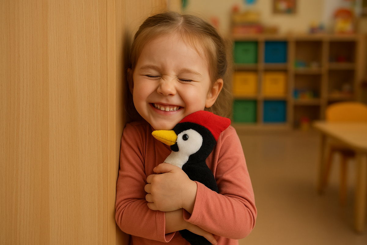 Она тщательно прятала птицу. Под подушку в тихий час. Но... Бах, дятел снова оказался на полке.