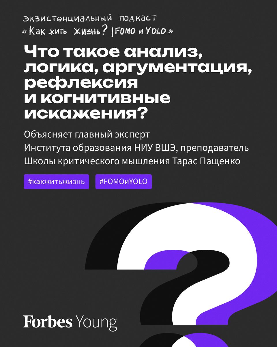 Как отличить факты от мнений и перестать соглашаться с большинством? Почему нам нужны логика, аргументация, рефлексия и умение распознавать когнитивные искажения? «Мы должны понимать, какую проблему решаем, что мы про нее знаем, что мы про нее не знаем, где получить недостающую информацию, какие могут быть варианты решения, и выбрать наилучший», — объясняет главный эксперт Института образования НИУ ВШЭ, преподаватель Школы критического мышления Тарас Пащенко. В 24-м выпуске подкаста «Как жить жизнь? | FOMO и YOLO» обсуждаем, как тренировать критическое мышление, чтобы мыслить яснее и принимать взвешенные решения. А в карточках рассказываем, на чем оно строится. Слушайте выпуск прямо сейчас: • на сайте Forbes • в Apple Podcasts • в Яндекс Музыке • в Telegram • в Spotify • или на другой удобной платформе Что такое анализ? «Анализ — это операция, связанная с тем, что мы разлагаем ситуацию на части. Вот у нас есть какая-то целостная проблема, и мы ее делим на отдельные к