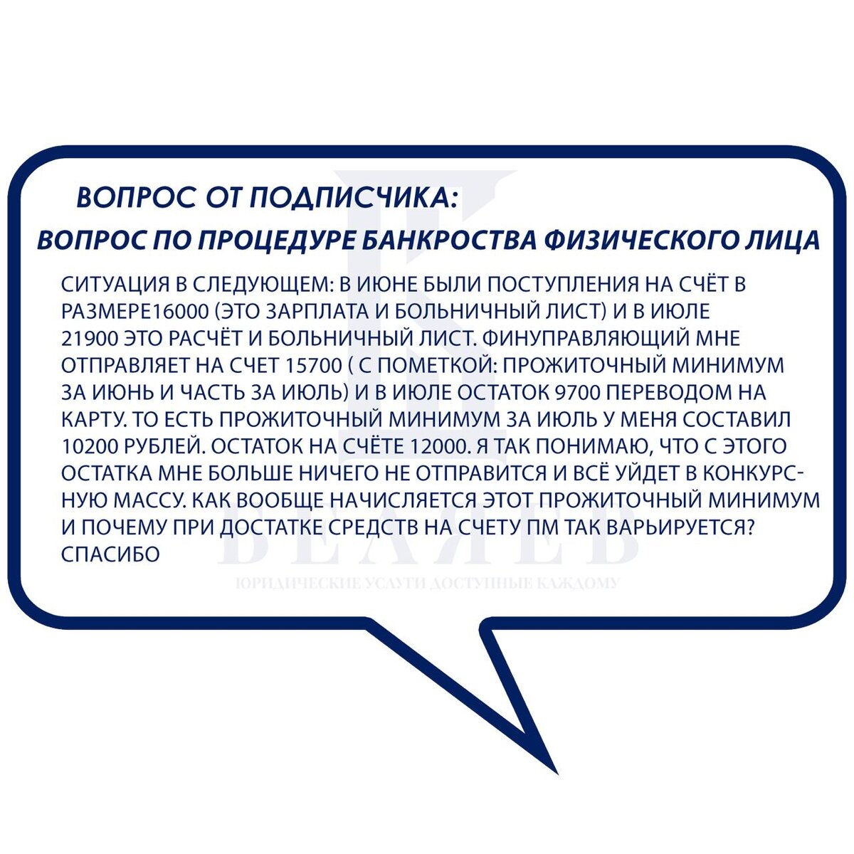 🌟Рубрика вопрос-ответ:🌟 Здравствуйте! 😊 Ваша ситуация действительно требует внимательного анализа. Давайте разберёмся с вопросом о прожиточном минимуме и конкурсной массе при банкротстве. 1. Прожиточный минимум: 📊 Прожиточный минимум устанавливается в зависимости от региона и может варьироваться в зависимости от различных факторов, включая состав семьи и уровень доходов. Обычно он рассчитывается на основе потребностей человека в основных жизненных ресурсах, таких как питание, жильё, одежда и другие необходимые расходы. 2. Расчёт прожиточного минимума: 💵 В вашем случае, если финуправляющий отправляет вам средства, указывая на прожиточный минимум за июнь и часть за июль, это может означать, что он учитывает ваши доходы и расходы, чтобы определить, какую сумму вам необходимо оставить для жизни. Если ваши поступления превышают прожиточный минимум, то излишки могут быть направлены в конкурсную массу. 3. Остаток на счёте: 📉 Если остаток на счёте составляет 12 000 рублей, и финупра
