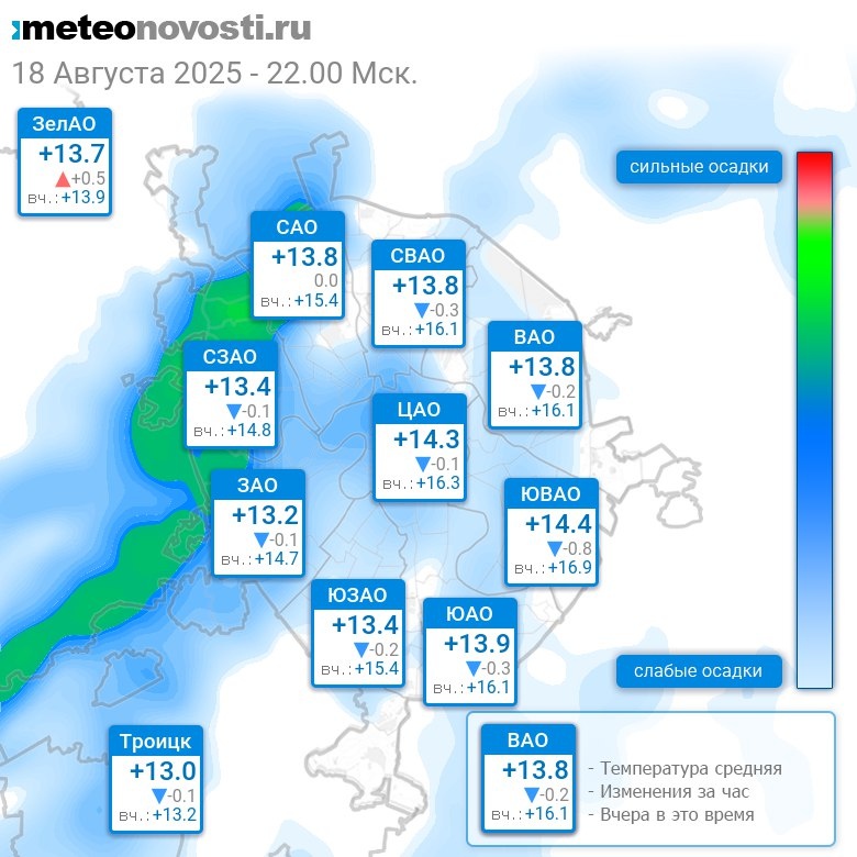 В 22:00 в Москве было от +13°C до +14.6°C, средняя температура +13.8°C #погода #Москва #лето #температура #18августа #понедельник