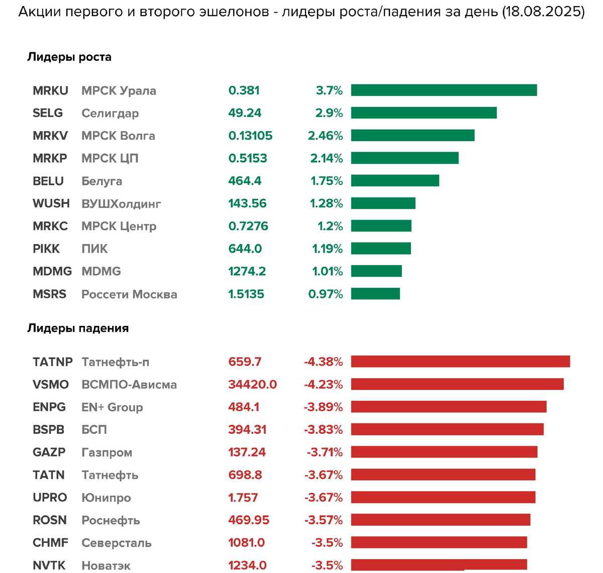 Всем привет! По итогам основной сессии 18 августа индекс Московской биржи потерял 2%. Падение началось еще в субботу после не очень успешных переговоров на Аляске. При этом рынок положительно отреагировал на первые новости со встречи Трампа и Зеленского: Можно предположить, что спекулянты были вынуждены закрыть шорты. Курс рубля стал потихоньку ослабевать после отмены репатриации валютной выручки экспортеров. Нефть продолжает торговаться в диапазоне 66-67 дол/барр. Многие ждали рекомендации дивидендов Татнефти - дождались скромных 2% за первое полугодие: Очередная акция для владельцев брокерского счета в Альфе - крутите "рулетку" в банковском приложении, смотрите, что выпало. Если устраивает приз покупаете 22 августа на 1000 рублей на брокерский счет и получаете выпавший подарок. Альфа - один из немногих брокеров, кто балует своих клиентов такими подарками. Если до сих пор нет счета, то стоит воспользоваться акцией и открыть новый счет и получить 10000 рублей кэшбэка: Рассказал про сво