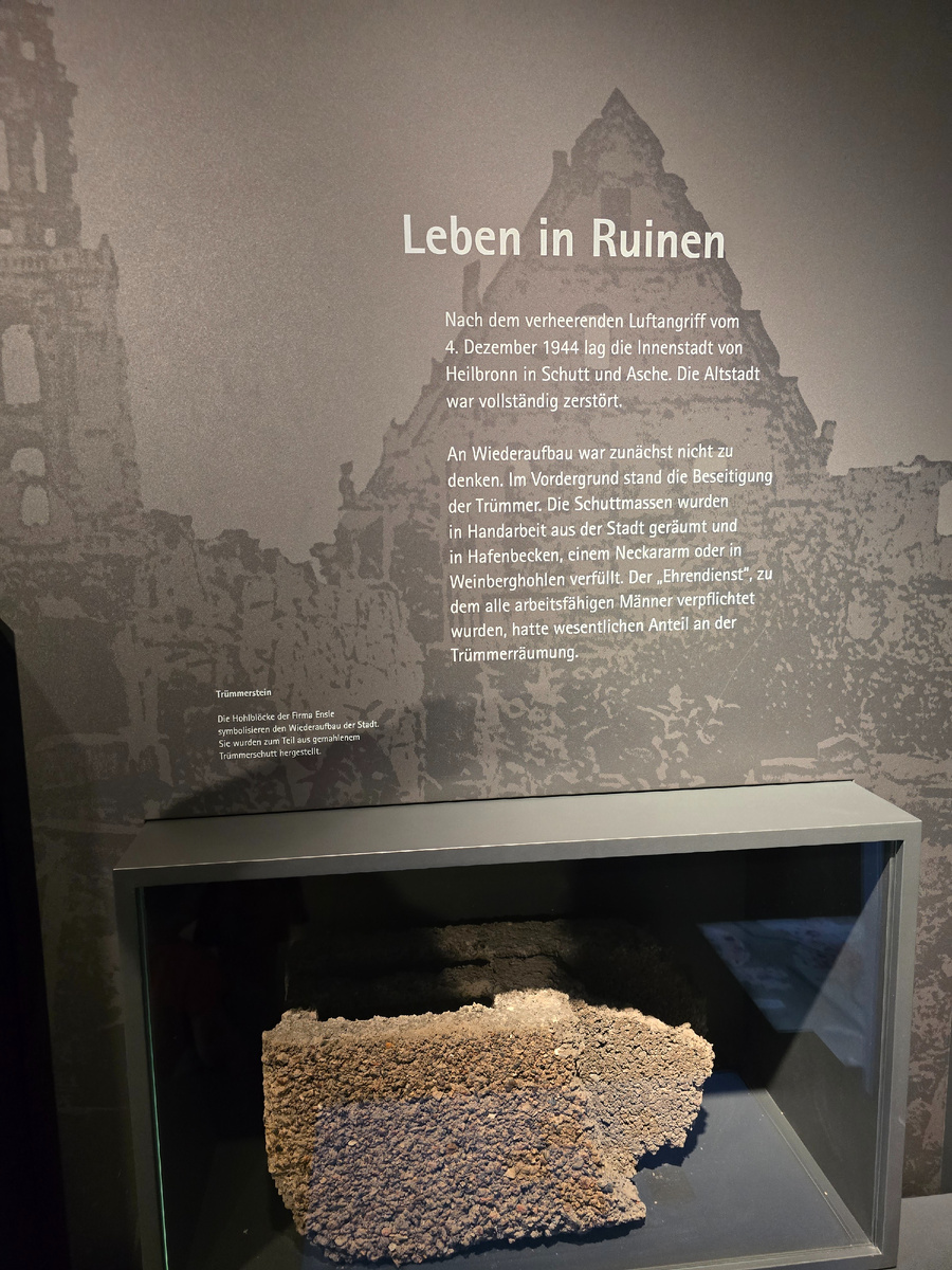 Недавно мы побывали в музее в Хайльбронне, и одна из самых сильных экспозиций — про жизнь после разрушительного бомбардирования города 4 декабря 1944 года. Место оказалось неожиданно глубоким и трогательным. Расскажу немного о том, что особенно зацепило. „Nach dem verheerenden Luftangriff vom 4. Dezember 1944 lag die Innenstadt von Heilbronn in Schutt und Asche. Die Altstadt war vollständig zerstört.“ После разрушительной бомбёжки центр Хайльбронна лежал в руинах, старая часть города была полностью уничтожена. „An Wiederaufbau war zunächst nicht zu denken. Im Vordergrund stand die Beseitigung der Trümmer...“ О восстановлении тогда не могло быть и речи — сначала нужно было убрать завалы вручную. Обломки вывозили и использовали как строительный материал. Один из экспонатов — "Trümmerstein", кирпич, изготовленный из этих самых руин. Ты смотришь на него и понимаешь, сколько усилий, боли и труда вложено в каждый камень. „Die Familie des Böckinger Pfarrers Theodor Zimmermann bekam 1945 v