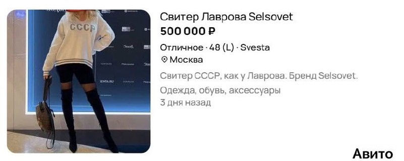 В ответ на пост 😳 Челябинский свитер как у Лаврова вырос в цене до полумиллиона рублей Предприимчивые россияне начали активно продавать свитеры с надписью «СССР» на сайтах объявлений. Цены на оригинальные свитера SelSovet доходят до 500 тысяч рублей, а аналоги можно купить за 2,5-50 тысяч рублей. #город@chelyabinsk_smi Как думаете, стоит ли он таких денег? 👍/👎 👍 Подписаться | Прислать новость