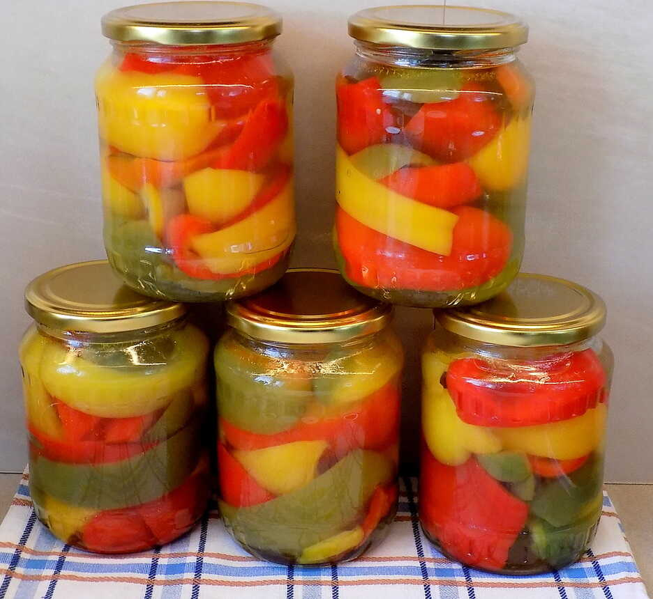 Это простой и проверенный бабушкин рецепт маринованных перцев. Перец получается слегка кисловатым, хрустящим и идеально подходит для салатов и мясных блюд. 2 кг разноцветных сладких болгарских перцев 1,5 л воды 1/3 стакана сахара 2 ст. л. соли 0,5 стакана уксуса 9% 50 мл растительного масла лавровый лист 3 штуки душистый перец 5 горошин черный перец 10 горошин Нарежьте каждый перец полосками без семян и плодоножки. В большой кастрюле доведите до кипения ингредиенты для маринада для перца. Добавьте нарезанный перец в кипящую жидкость и варите на медленном огне около 5 минут, постоянно помешивая. К этому времени перец начнет немного развариваться, но еще останется слегка хрустящим. Если вы предпочитаете более мягкую консистенцию, варите около 7–8 минут. Наполните чистые стерильные банки перцем, залейте маринадом и герметично закройте. Положите ткань или полотенце в большую кастрюлю, расставьте банки свободно, чтобы они не соприкасались, и залейте их горячей водой (температура воды должн