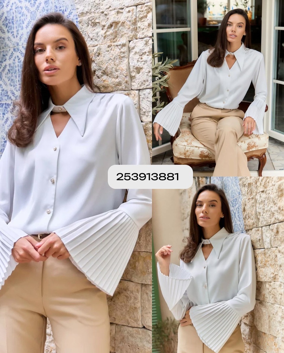 - Что видим на фото: холодный молочный/ледяной оттенок, гладкая струящаяся ткань. Главный акцент — широкие плиссированные «колокола» на рукавах. Воротник — увеличенный, графичный, с V-образным вырезом и мини-стойкой-каплей.