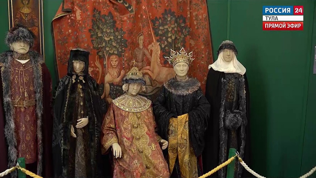 Сергей Эйзенштейн снял «Ивана Грозного» в сорок четвёртом. Тяжёлые боярские одеяния с выставки «Собиратели земель русских» помнят великого режиссёра. Есть версия, что Сталин лично разрешил использовать при пошиве исторические ткани и фурнитуру. С художниками по костюмам поделились музеи. Так что это – дважды экспонаты. «Натуральный мех, парча, парчу привозили из-за границы, свою не изготовляли, золотная нить. Мы видим, что и ткань старая, и пуговицы традиционные круглые, и вышивка не XXI века явно», – показывает костюм заведующая культурно-образовательным отделом Богородицкого дворца-музея и парка (Тульское музейное объединение) Ольга Перова. Эйзенштейн снял две части «Ивана Грозного», третью поручили Ивану Пырьеву. Смерть Сталина нарушила планы, но по эскизам и раскадровке можно понять задумку режиссера. В следующем зале – ещё одна переломная эпоха. Костюмы из фильма «Юность Петра» Сергея Герасимова сшиты современными студентами по эскизам. Характеры Петра и его соправительницы царевн
