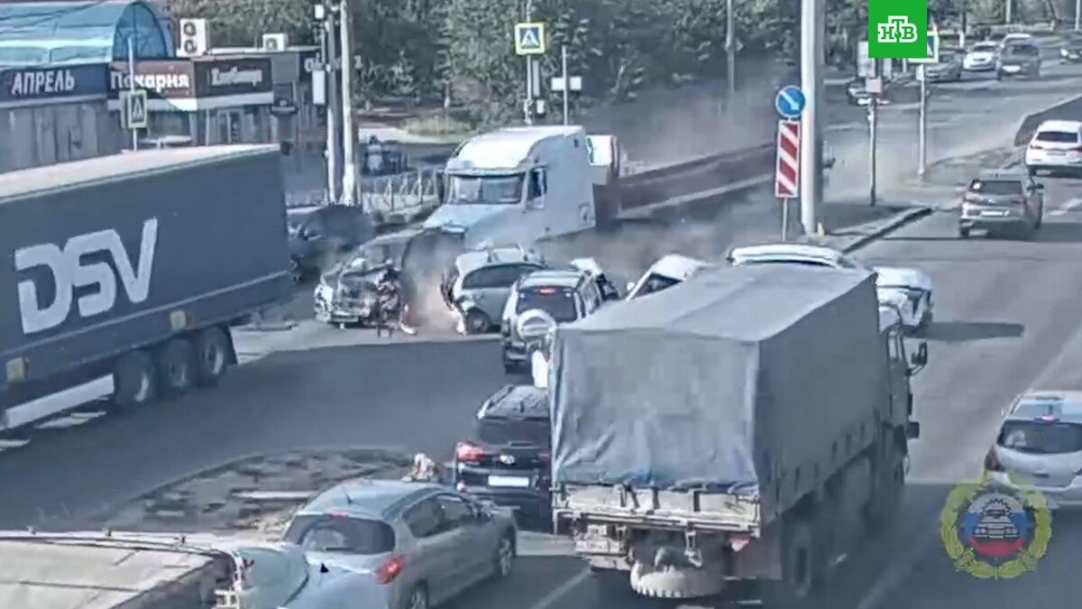 [ Смотреть видео на сайте НТВ ] Один человек пострадал при столкновении грузовика и семи легковушек в Волгограде, сообщает ГУ МВД России по Волгоградской области. Ведомство опубликовало видео с моментом ДТП. На записи видно, что машины выстроились в очередь перед светофором. В следующий момент их сзади на скорости сносит фура. Несколько машин от удара отбросило в сторону. Как сообщили в полиции, массовая авария произошла на пересечении Университетского проспекта и Краснопресненской улицы. При столкновении машин пострадал водитель одной из легковушек. На месте работают экипажи Госавтоинспекции. О причинах ДТП пока информации нет. [ Смотреть видео на сайте НТВ ]