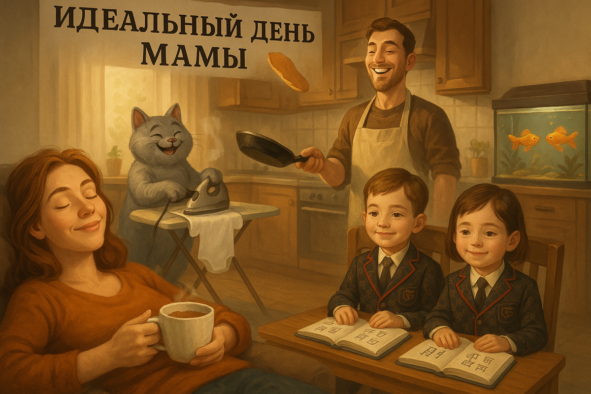 Идеальный день мамы — это как единорог: все про него слышали, но никто не видел. Проснулась в 10 утра. Не от "МААААААА!", не от соски в глаз и не от дрели соседей, а потому что выспалась. …и первое, что подумала: "Где подвох?" Муж сварил овсянку, испек блинов, покормил детей, убрал за котом лоток и теперь сидит майнит биткоины. Дети поели овсянку и блины. Умытые, причесанные и красивые в костюмчиках Gucci сидят за столиком с прямой спиной и учат китайский. Самый маленький член семьи не плачет, не требует "качай-носи-корми", а сладко спит днём больше двадцати минут подряд. И даже не перепутал день с ночью. Кот не орёт, не блюёт и не носится по квартире. (если мы сегодня фантазируем, то кот гладит бодики и мурлычит "Мамочка молодец") Мама посмотрела на себя в зеркало — и там не зомби с пакетами под глазами, а свежая женщина, как с рекламы крема. Золотые рыбки плавают в аквариуме — молчат и сияют. Иногда подплывают к стеклу и глазами шепчут: "Ты богиня". Свекровь позвонила. Сказала: "Ты