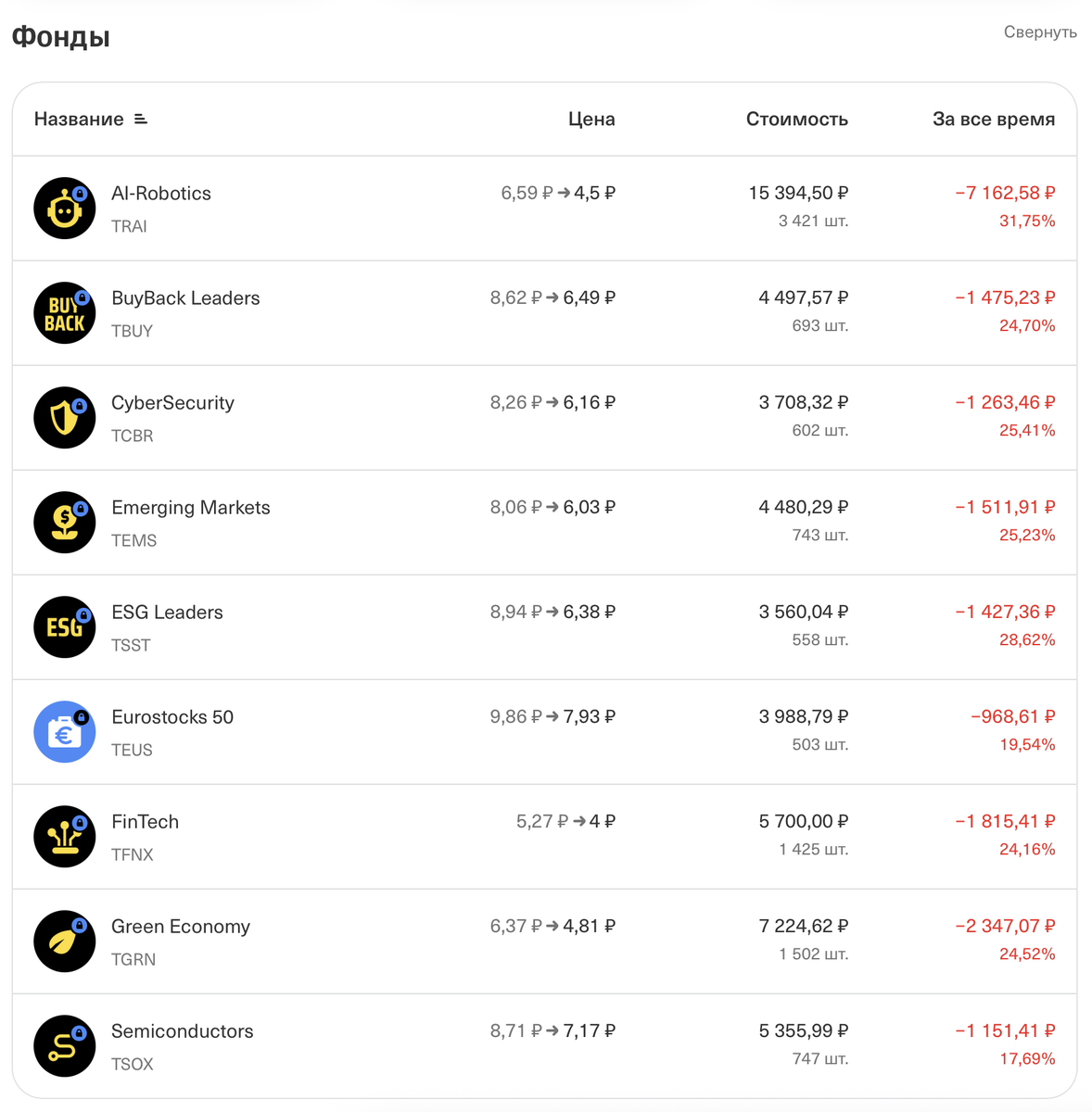 На современном фондовом рынке представлено огромное количество инвестиционных инструментов. Особой популярностью пользуются инвестиционные фонды: на облигации, дивидендные акции, акции роста или бумаги отдельных компаний. Основное преимущество фондов — низкая стоимость входа. Цена пая часто составляет всего 5-10 рублей, что делает их доступными даже для начинающих инвесторов. Для новичков это действительно отличный вариант — можно с минимальными вложениями познакомиться с рынком и понять его механизмы. Основные плюсы фондов: Ключевые риски: Несмотря на очевидные плюсы фондов, я склоняюсь к прямым инвестициям в ценные бумаги. Вот почему: Хочу поделиться своим опытом работы с фондами. В сентябре 2023 года я сформировал портфель из фондов зарубежных компаний, вложив около 50 000 рублей. К сожалению, менее чем через два месяца, 1 ноября 2023 года, из-за санкций все активы оказались заморожены. Цена на акции фондов упала на 20–30%. Этот опыт показал мне, что даже при работе с проверенным бр