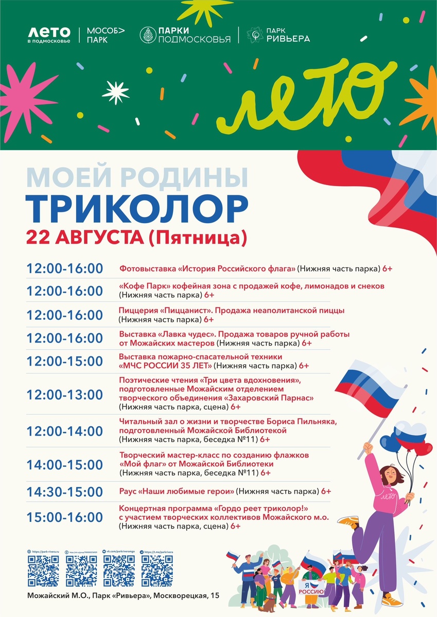 🇷🇺🎉 Дорогие друзья! Приглашаем вас в парк «Ривьера» отметить День Государственного флага Российской Федерации на нашем замечательном мероприятии «Моей Родины Триколор»! 🎈✨ 📅 22 августа с 12:00 мы подготовили для вас насыщенную программу: 📸 Фотовыставка и выставка «Лавка чудес» 🚒 Выставка пожарно-спасательной техники 📜 Поэтические чтения и читальный зал 🎨 Творческий мастер-класс 🎶 Концертная программа с участием творческих коллективов Можайского муниципального округа, которая подарит вам море положительных эмоций и хорошего настроения! Не упустите возможность провести этот день вместе с нами, погрузиться в атмосферу патриотизма и любви к Родине. Ждем вас в нашем парке!
