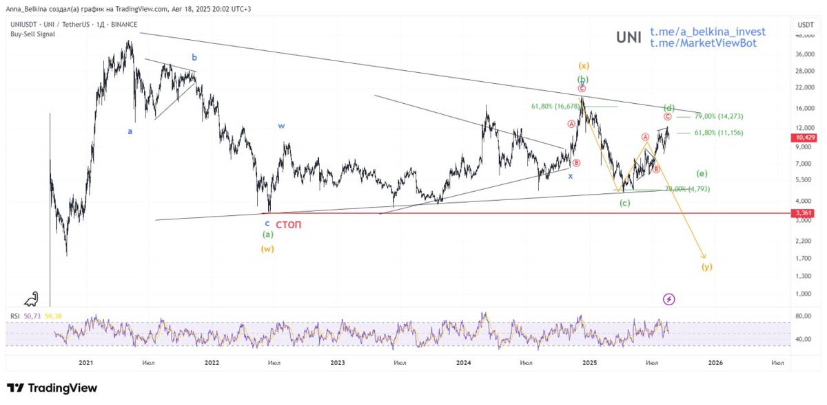 #UNI Монета смогла развить гармоничное движение в восходящей волне (d) треугольника, подтвердив треугольник, а не нисходящий дзз. Цена зашла в диапазон между 61.8%-79% Фибо, по структуре завершив одинарный зигзаг. Волна с of (d) встала в виде КД, если и будет локальное обновление верха, то за счет усложнения волн в КД. В целом, здесь для завершения структуры треугольника остается сформировать волну е of (iv) c выходом наверх в (v). Для долгосрочных позиций стоп можно подтянуть на волну (с), для среднесрочных/спекулятивных позиций можно зафиксировать часть прибыли. Не является ИИР ☄️ Последний день действия промокода Август2025 на 25% скидку на любой тариф закрытого канала. 💪 Бот Закрытого Канала (подписаться из-за границы, пишите личным сообщением)