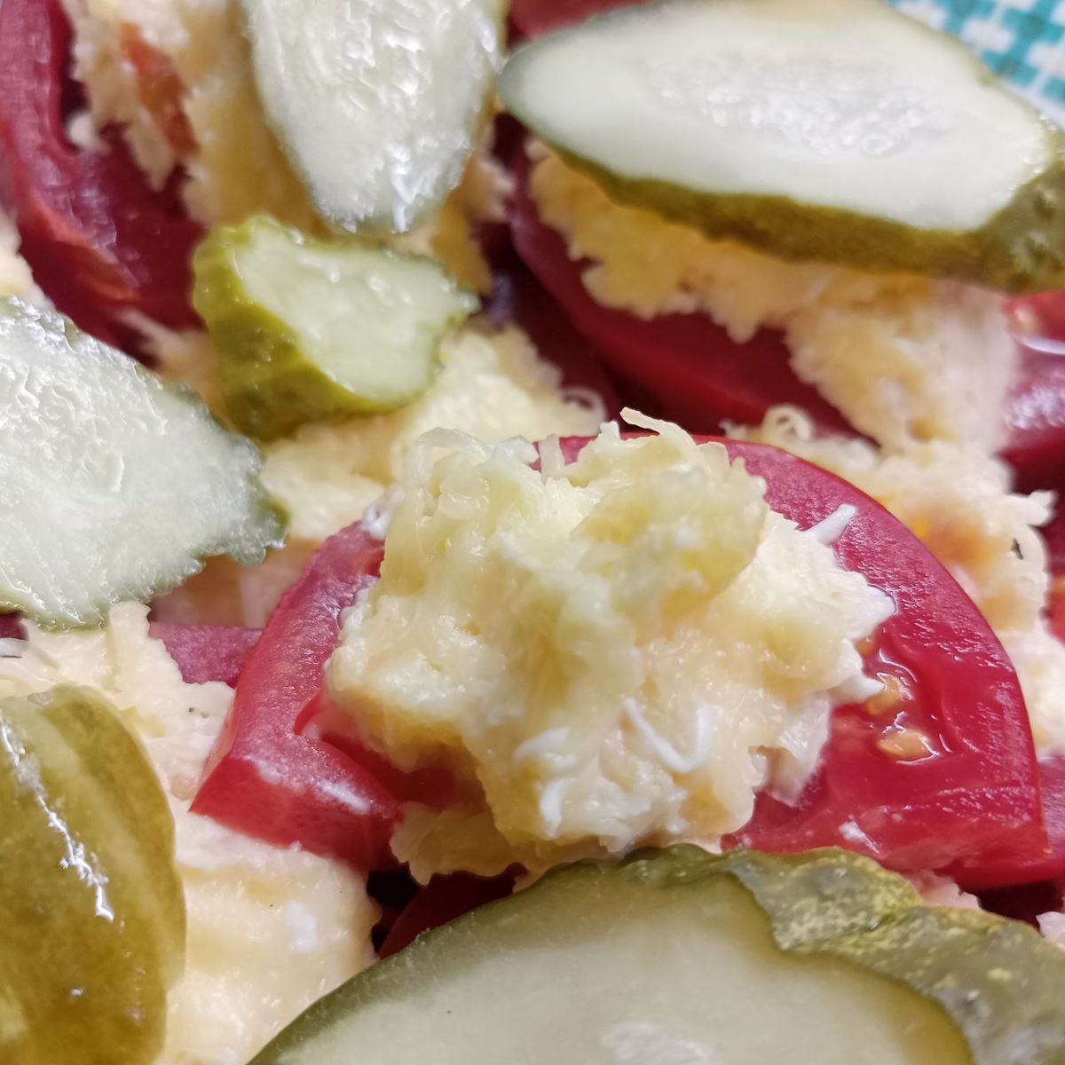Почему-то совсем забыла про этот советский рецепт. Сыр натираем на мелкой тёрке. Такую же манипуляцию проводим с яйцами. Не забываем про чеснок и "святой Мазик". Ароматно, свежо, необычно в сочетании со зрелыми томатами. Расходятся на "ура". Прекрасные помидоры - результат трудов матушки Марфы Петровны Нины Ивановны. Мне подарили ведро и теперь наслаждаемся настоящим вкусом этих прекрасных ягод.