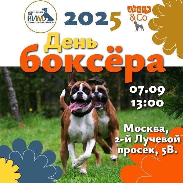 Отпрашивайтесь с работы, откладывайте отпуска, забывайте про дачу. 07 сентября 2025 в 13:00 состоится День Боксера в МОСКВЕ! Московский кинологический клуб КИМ vk.com/kimdogclub и команда помощи собакам породы боксер Boxer&Co приглашают всех владельцев и любителей немецкого боксера собраться и тепло провести этот день вместе! Это отличная возможность снова встретиться! Приглашаем всех владельцев и ценителей немецкого боксера! Это мероприятие для всех собак, их хозяев, соседей, друзей и всех, кто любит породу НЕМЕЦКИЙ БОКСЕР. Для всех боксероводов, боксероведов и боксеролюбов! Мы рады всем, холодно не будет никому, скучно – тем более!!! Старожилы, отрывайте ..опы с насиженных диванов, новички – не тушуйтесь и не стесняйтесь! 🚘 Праздник пройдет на площадке "Кинологический Стадион Сокольники" по адресу Москва, 2-й Лучевой просек, 5B ✨✨✨✨✨✨✨✨✨✨✨✨✨✨✨✨✨✨✨✨✨✨✨ ‼Важная информация! Регистрация обязательна: WhatsApp +7(916)0933333: ваше имя , количество взрослых, количество детей, количество