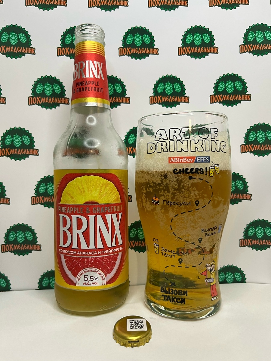Статистика: пивной напиток пастеризованный, алкоголь - 5.5% об., экстрактивность начального сусла - 16.7%, состав: вода питьевая, солод пивоваренный ячменный, глюкозно-фруктозный сироп, кукурузная крупа, хмелепродукты, регулятор кислотности - кислота лимонная, ароматизаторы пищевые. Объём: 0,45 л Дата розлива: 28.05.2025 Изготовитель: АО «АБ ИнБев Эфес», Россия, Московская область, г. Клин, филиал в Саранске; Россия, Республика Мордовия, г. Саранск По-братски: вот этот напиток я встретил в «Чижике», они периодически стали привозить разное пиво и похожие на него напитки, продавать и потом никогда больше не привозить. И вот они привезли вот этот Brinx, который варит теперь «ИнБев Эфес», или не теперь, а заодно. Дело в том, что алко коктейль под таким брендом есть в «Чижике», но варит его другая контора. Возможно, что бренд Brinx, просто СТМ марка «Чижика». Но так или иначе вот такая новинка. Будем пробовать. Очень яркий аромат ананаса, мощная газация, во вкусе сладость доходящая практиче