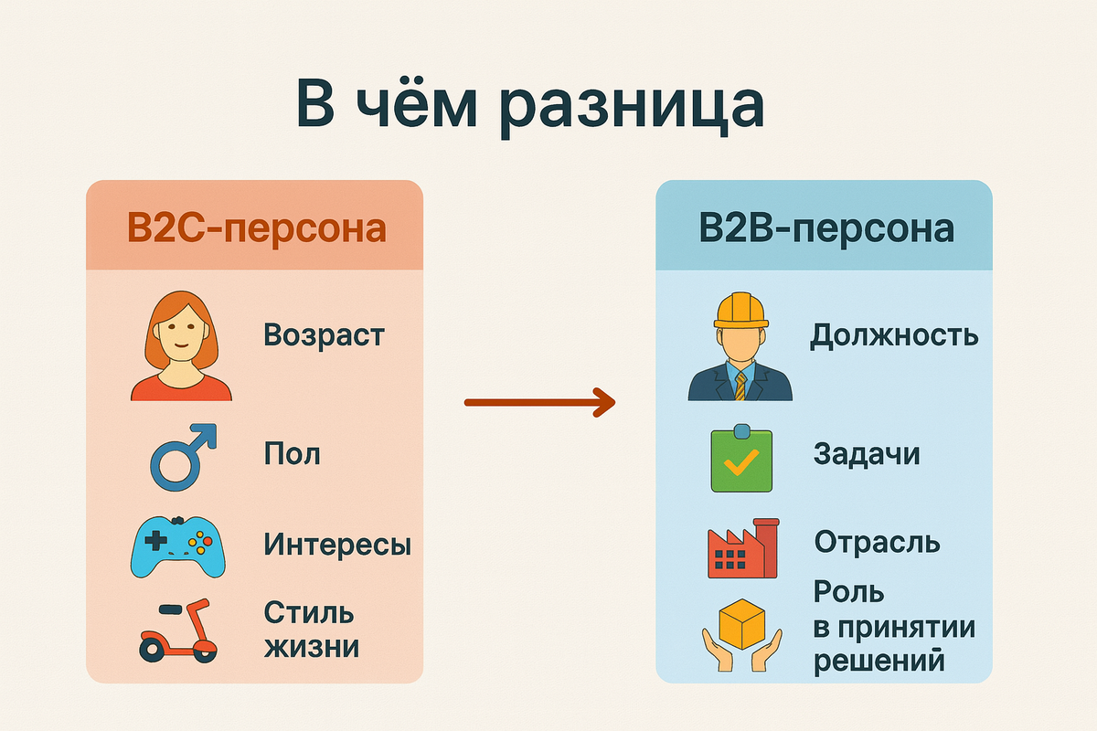 Задумывались ли вы, почему один и тот же продукт в руках разных компаний «выстреливает» по-разному? Одни заключают десятки сделок, другие — месяцами топчутся на месте. Разница в том, насколько чётко они понимают, кому именно продают. В B2B-сегменте это особенно важно. Здесь покупку решает не один человек, как в B2C, а целая команда. Ошибка в понимании клиента стоит дорого: теряются деньги, время и репутация. В B2C всё относительно просто: возраст, пол, интересы, привычки — и вот уже портрет готов. В B2B всё иначе. Здесь значимы другие параметры: На практике решение о покупке проходит несколько этапов. Сначала есть инициатор — человек, который заметил проблему. Потом подключается пользователь, тот, кто будет работать с продуктом. Затем слово за директором или собственником, и в конце — проверка со стороны бухгалтерии или юристов. И каждый из них смотрит на сделку по-своему. Один думает о цене, другой о надёжности, третий о рисках. Поэтому портрет B2B-клиента — это не один человек, а цел