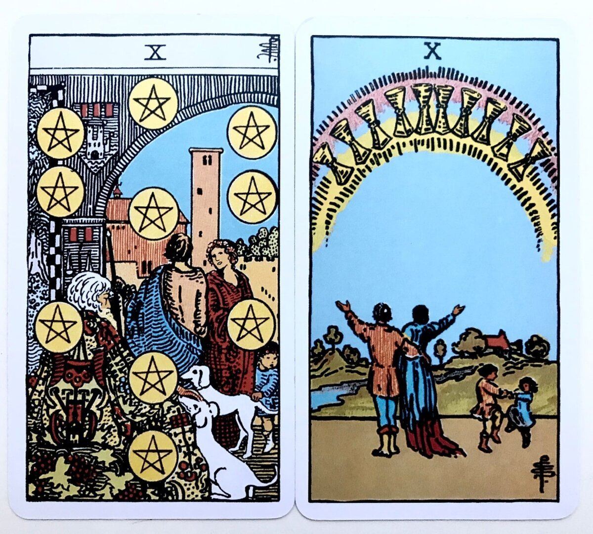 В колоде Таро есть карты, которые сами по себе светятся радостью, я имею в виду сейчас — 10 Кубков и 10 Пентаклей. Эти карты напоминают поздравительную открытку, на которой «идеальная семья»: дом, дети, любовь, изобилие и спокойствие. Карты, где всё как в сказке — счастье и благополучие на ладони.