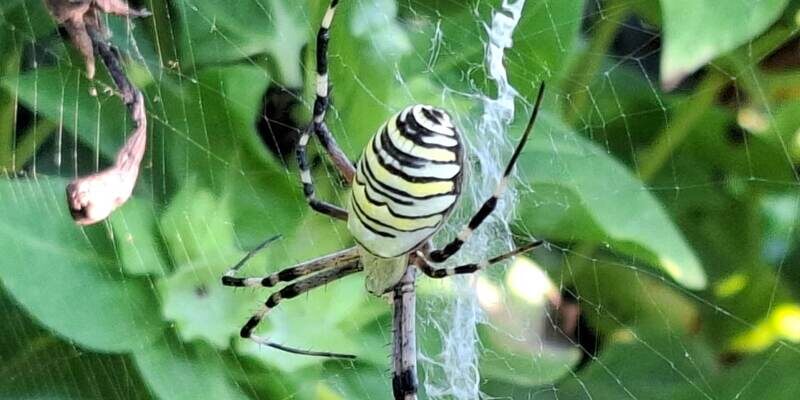 Самку Аргиопы не спутаешь ни с кем. Это та самая "оса" размером с хорошую монету (само тело до 3 см, а с лапками – все 5!). Брюшко у нее – ну прямо тельняшка морская: ярко-желтые и черные полоски чередуются. Самцы, как часто бывает, мельче и скромнее – серенькие, неприметные. Паутину плетут особую – большую, колесом, да еще часто с плотным зигзагом по центру (этот "автограф" называется стабилиментум). Любят солнышко, открытые пространства: луга, опушки, а теперь – огороды, газоны и ваши любимые кусты смородины. Сидит себе этакая яркая пуговка в центре сети – и ждет обед.