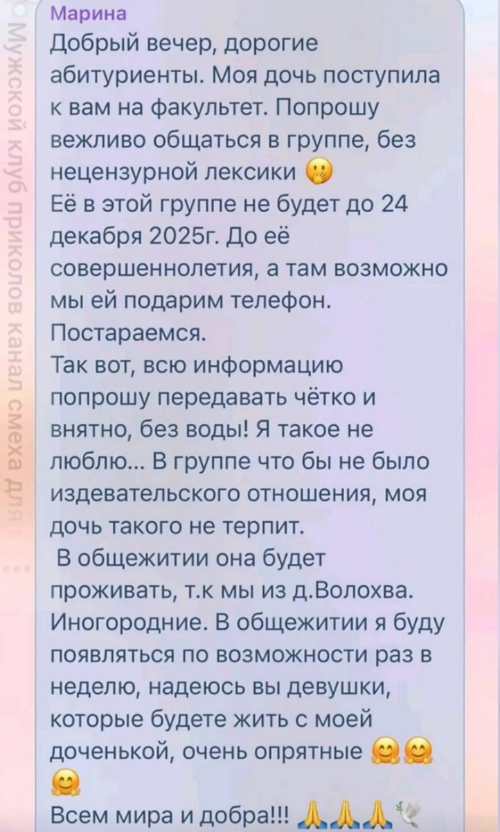 В одном из ВУЗов мамулятор так сильно волнуется за собственное чадо, что решила добавиться в чат первокурсников вместо 17-летней дочери. Женщина сразу же задавила сопляков авторитетом и установила свои правила. Отныне в чате писать без воды и мата, строго по существу. Дитятко не обижать. В общежитии быть опрятными в присутствии любимой доченьки. В противном случае будут последствия. Какие — лучше не знать. Планирует находиться в чате мамаша до совершеннолетия ребёнка. На совершеннолетие, ВОЗМОЖНО, девушке подарят телефон и она самостоятельно сможет пообщаться с одногруппниками в сети. Практическое пособие как уничтожить самооценку дочери на ближайшие 4 года