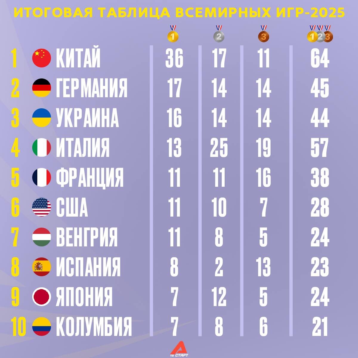📊🌍 А вот и турнирные итоги Всемирных игр-2025! Китай, хозяин соревнований, стал победителем, уверенно оторвавшись от преследователей. Россия тоже выступила очень достойно, с медалями уехал почти каждый второй спортсмен! 💪🏻 Будем скучать по этому турниру! 😪 🛒 Наше приложение в Google Play 💙 Наше приложение в RuStore 🛒 Наше приложение в App Store