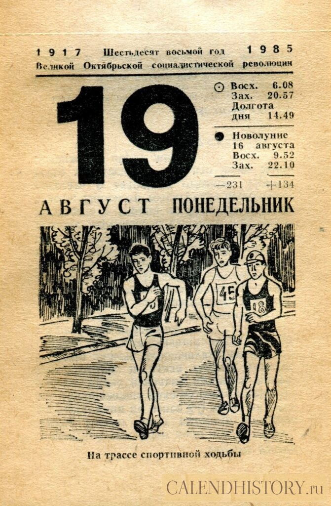 Итак, сегодня 19-го августа и у нас на календаре 1985-й год. Перед нами листок советского календаря для женщин. На календаре у нас понедельник - 19 августа 1985-го года. На трассе спортивной ходьбы *** Оборотную сторону листка этого календаря можно посмотреть у нас по ссылке на сайте. Другие листки советских календарей смотрите у нас на сайте - CALENDHISTORY.ru ПОСМОТРИТЕ ЕЩЁ ЛИСТКИ ОТРЫВНЫХ КАЛЕНДАРЕЙ: