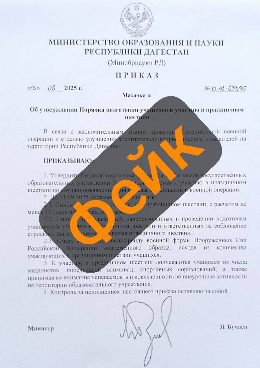 ❗️Фейковый файл под видом приказа министра образования и науки Дагестана Яхьи Бучаева распространяется в социальных сетях. В "документе" требуется согласовать до 1 сентября списки учащихся 1-11 классов для участия в некоем шествии, посвящённого Дню победы. Помимо этого, должны быть назначены ответственные за соблюдением строевого шага и составлена смета за пошив военной формы. Подписаться на "Черновик" 2.0 | Обратная связь: @chernovik_1_bot