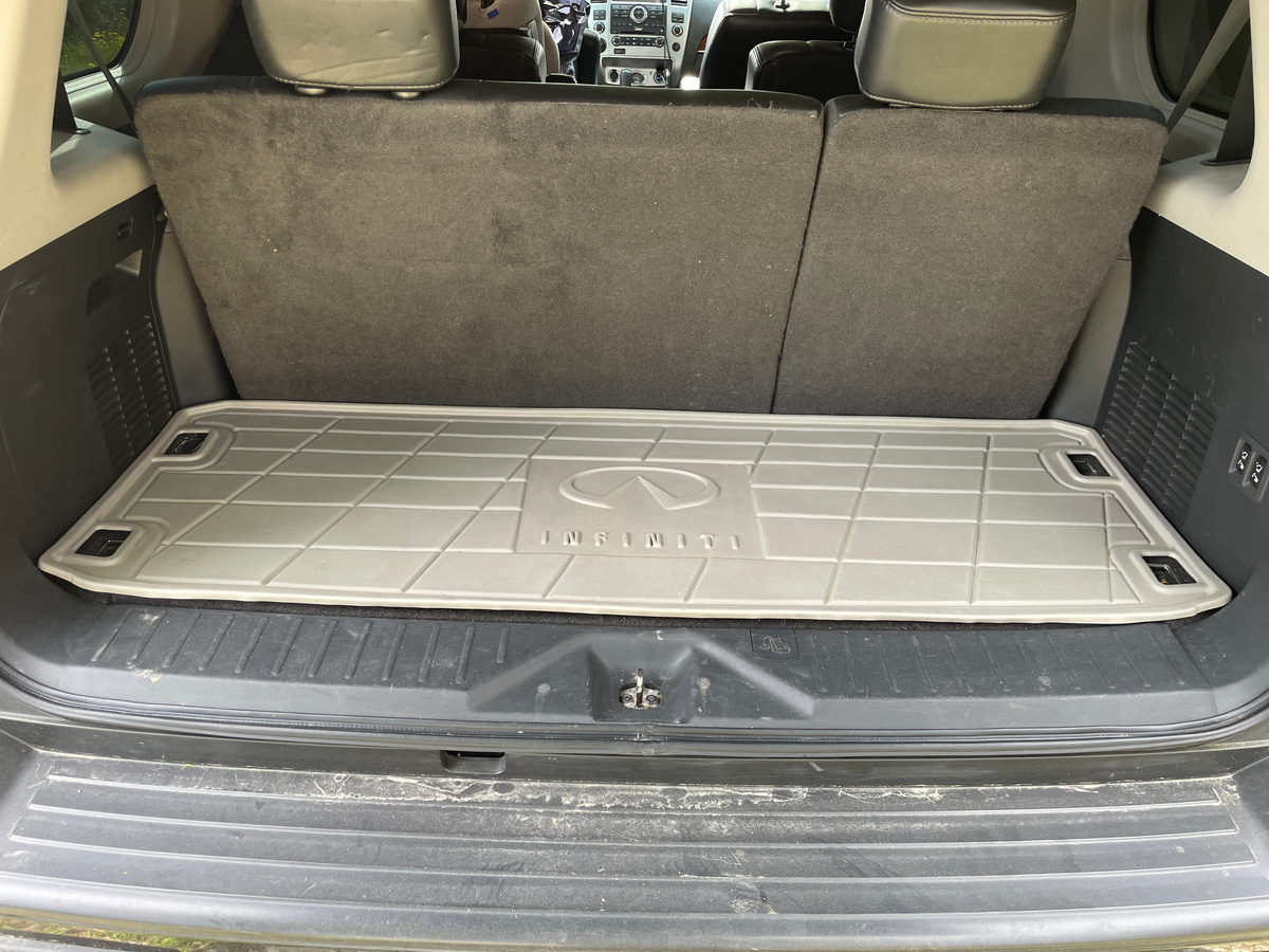 Казалось бы Инфинити КуИкс 56 с большим багажным пространством, при сложенном 3-м ряде сидений, но при этом имеет малюсенький защитный коврик. Когда складываешь сиденья 3-го ряда в пол - получается так, что их спинки не защищены от груза. Приходится что-то подкладывать или подстилать, прежде чем загружаться. И если этого не сделать, то есть риск повредить, затереть или банально запачкать спинки сидений. В моём случае на Infiniti QX56 2008 г.в. коврик идет серого цвета. При этом салон у меня с чёрной кожей. Встречал на моделях FX35 серии именно чёрные коврики под чёрный салон, а тут почему-то серый. Справа и слева в коврике имеются отверстия для доступа к проушинам. Через них можно зафиксировать груз, что должно быть удобно, но сказать честно - я, за 4 года эксплуатации, ни разу ими так и не воспользовался. Кстати, коврик изготовлен из интересного поливинила, он одновременно и жёсткий как пластик и не скользящий как резина, что очень удобно при перевозке вещей. Вот так выглядит ковролин