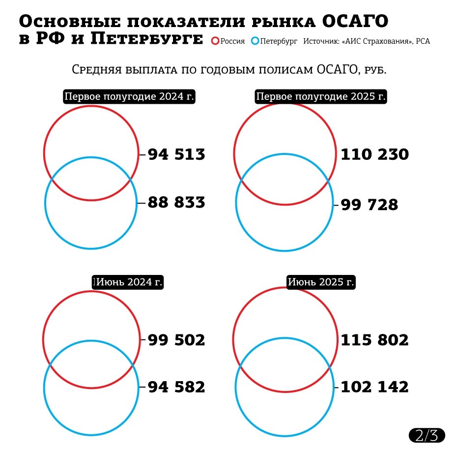 В части выплат в Петербурге динамика обратная. По годовым полисам ОСАГО средняя выплата выросла на 12,3%, до 99 728 рублей (по России на 17%, до 110 230 рублей). В июне средняя выплата составляла в городе 102 142 рубля против 94 582 рублей в июне 2024–го (в РФ 115 802 против 99 502 рублей соответственно). Общий объём выплат по стране вырос за полугодие на 13%, до 115,1 млрд рублей. Данные ЦБ в региональном разделе пока не опубликованы.