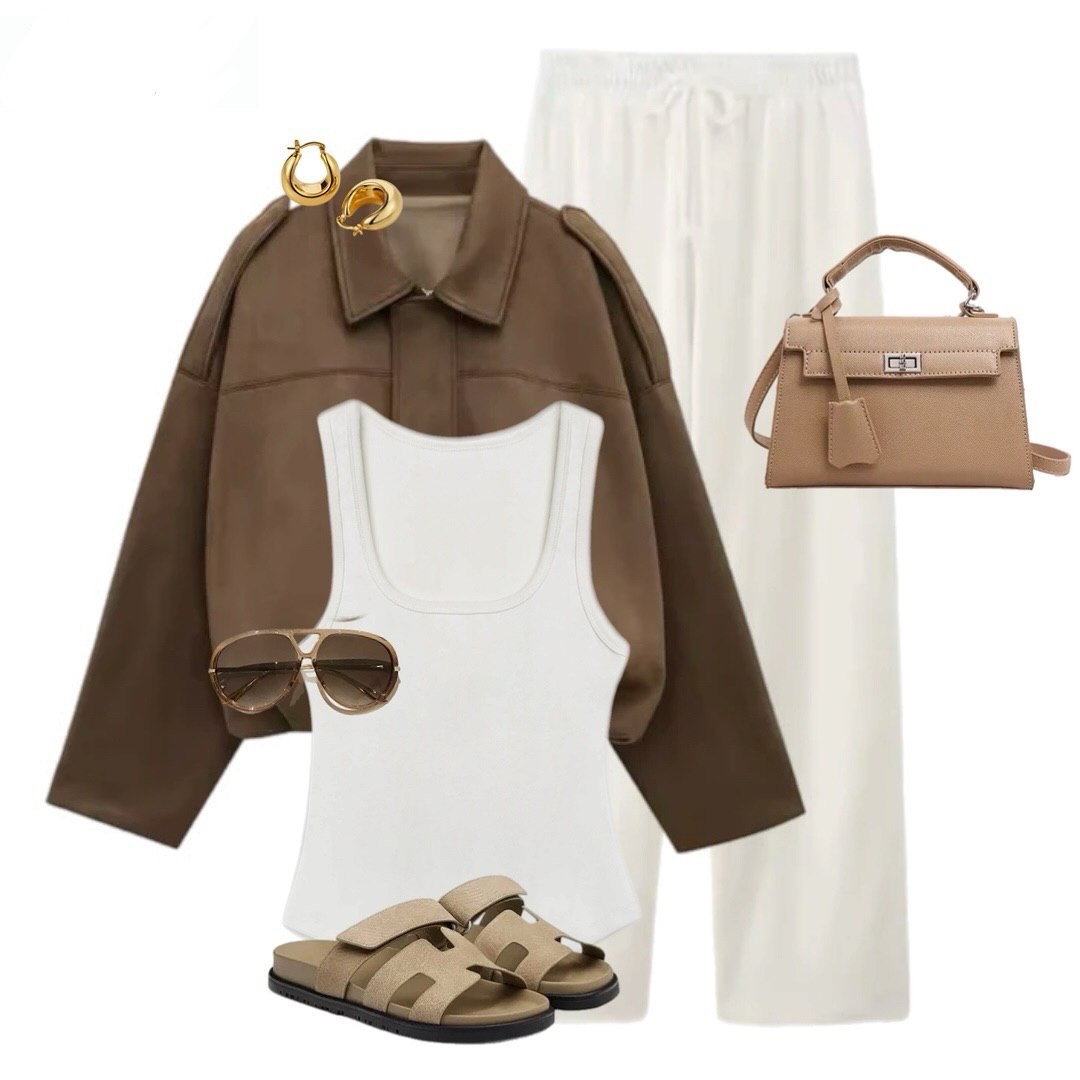 Осень — время «умных» сочетаний: тёплые оттенки, мягкие фактуры и многослойность, которая не утяжеляет. На коллаже — идеальный повседневный комплект в палитре капучино: шоколадный верх, молочные брюки, ванильный топ, песочные аксессуары и капля золота. Ниже — подробный разбор каждой вещи, зачем она нужна, как посадить и чем заменить, когда похолодает.