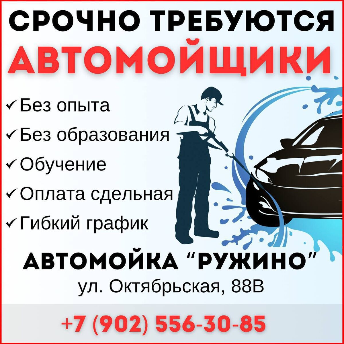На автомойку «Ружино» требуется автомойщик! Опыт и образование не имеет значения! Всему обучим👌 Работы много, машины есть всегда! 👉 Заработная плата сдельная 👉 Гибкий график работы Главное - желание работать и зарабатывать! Звоните +7 (902) 556-30-85, все вопросы обсудим!