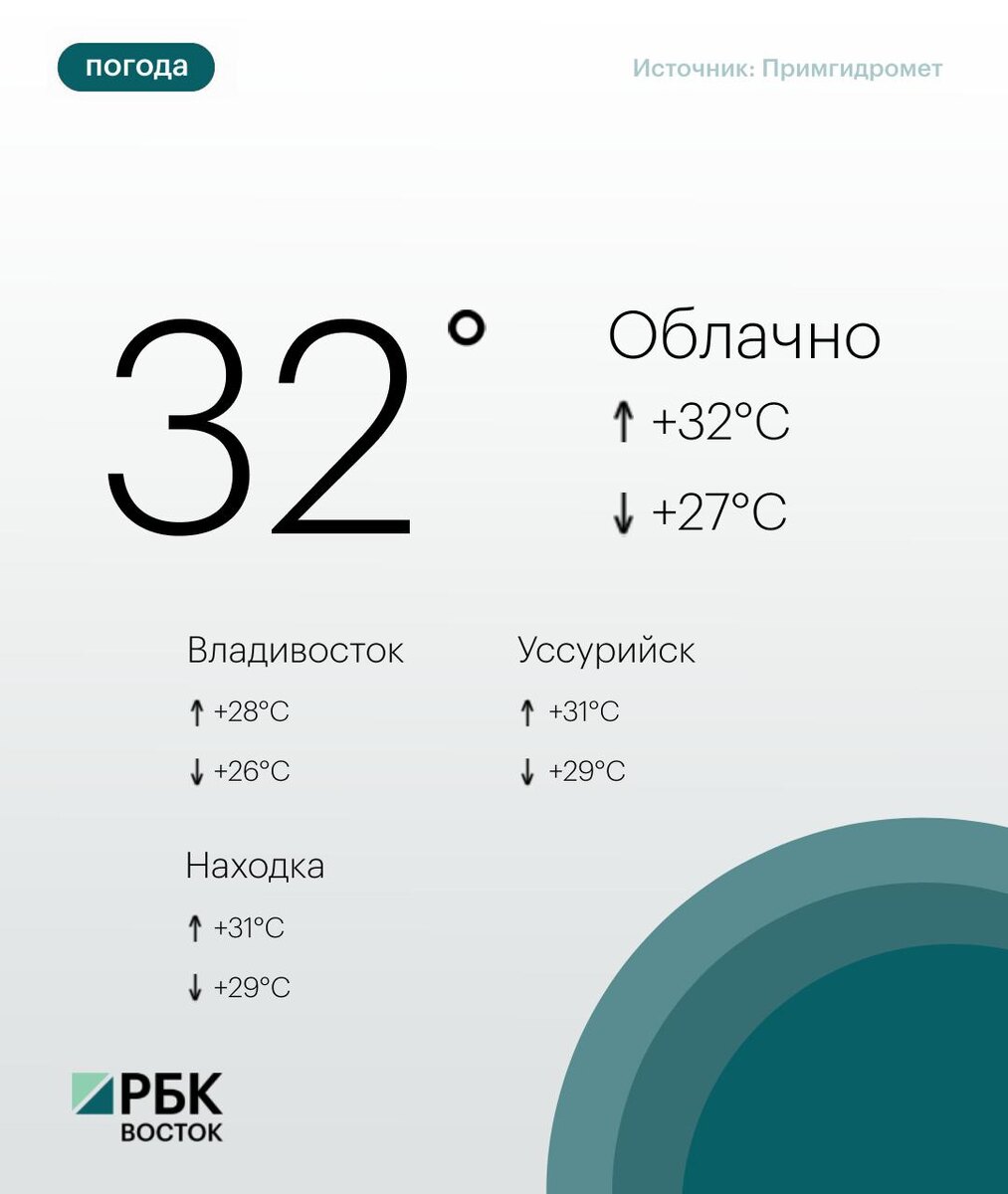 Сегодня погоду в Приморье определяют фронтальные разделы. Днём и вечером на северо-западе дождь. Ветер южный, юго-западный умеренный, на западе до сильного. Температура воздуха +27...+32°C 🌧 Во Владивостоке переменная облачность, днём преимущественно без осадков. Ветер юго-западный, южный умеренный до сильного. Температура воздуха +26...+28°C. 😃Подписывайтесь на РБК Восток