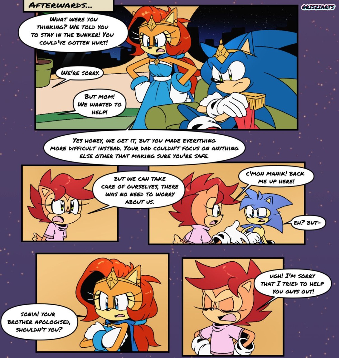 Это было утро : Салли готовила завтрак для своей семьи : дети ещё спали : Соник уже проснулся : и решил разбудить детей : они сразу проснулись : Соня Роуз : доброе утро тетя Салли ! Салли : ага , доброе! Соня Роуз , скажи ка мне на милость почему ты хочешь вернуть свою мать ?! чем я её хуже для тебя?! я же тоже как она люблю тебя, Соня Роуз : потому что ты мне не родная мать !!!! и я скучаю по маме!!!! и хочу чтобы она вернулась !!! с глаз синей ежихи текли слёзы : она в слезах выбежала из дома: Соник : соня !!!! Салли : да пусть бежит куда хочет ! Соник : Сэл , это не круто ! пусть моя дочь тебе не родная но , ты не имеешь право ей решать какую маму ей любить !