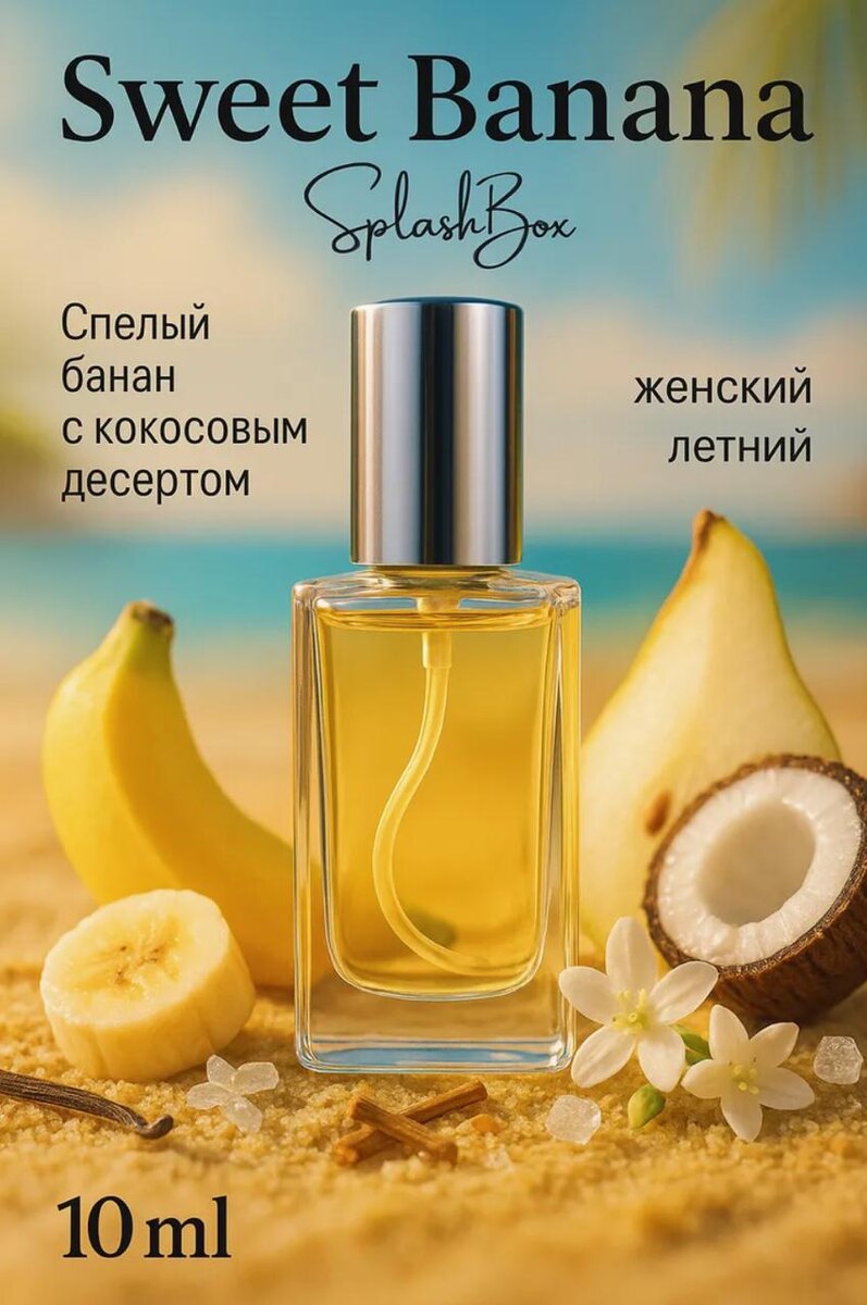 🍌🍌🍌🍌🍌🍌🍌🍌🍌🍌🍌 ⛱️⛱️⛱️⛱️⛱️⛱️ ⛱️⛱️⛱️ 🍌🍌🍌🍌🍌🍌🍌🍌🍌🍌🍌 Всем привет! ❤️ Алена дала рекламу этому аромату, поэтому мой аромат дня сегодня такой 🌞 Sweet Banana - спелый банан с кокосовым десертом 😁 Арт. 497642719 🥶 Арт. 2706715572 Аромат-референс - Maui in a Bottle Sweet Banana | 37 Eau de Parfum Kayali Fragrances Это аромат, который мгновенно переносит в экзотический рай, наполняя летним солнцем и мягким бризом. Он сочетает в себе сочную фруктовую свежесть и мягкую, тёплую основу. Звучание: Верхние ноты открываются ярким и солнечным аккордом банана и груши, словно спелые плоды, падающие в руку с дерева под ярким небом. Лёгкость и сладость этих фруктов создают атмосферу радости и беззаботного лета. Сердце аромата наполняет экзотический кокос и утончённый жасмин — тёплый, кремовый кокос и нежные цветы, создающие ощущение уединённого уголка на пляже, где волны шепчут, а солнце ласкает кожу. База уносит в тёплый мир ванили и сандала, их древесно-сливочная мягкость ок