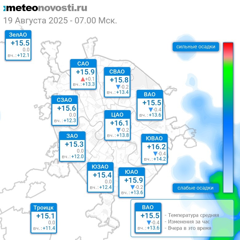 В 7:00 в Москве было от +14.6°C до +16.4°C, средняя температура +15.7°C #погода #Москва #лето #температура #19августа #вторник Перейти на сайт Прогноз погоды на 14 дней