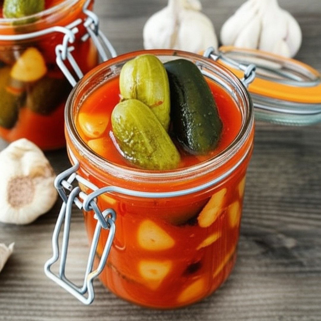 Огурцы в томатной заливке с чесноком Ингредиенты ⤵️ 🔸 Огурцы – 2 кг 🔸 Томатная паста – 200 г 🔸 Вода – 1 л 🔸 Чеснок – 1 головка 🔸 Соль – 2 ст. л. 🔸 Сахар – 3 ст. л. 🔸 Уксус 9% – 50 мл 🔸 Растительное масло – 100 мл 🔸 Лавровый лист – 2 шт. 🔸 Перец чёрный горошком – 5 шт. Приготовление 🥒 1. Огурцы промойте, обрежьте кончики. Если крупные – нарежьте толстыми кружками. Чеснок очистите и нарежьте пластинами. 2. В кастрюле смешайте воду, томатную пасту, соль, сахар, масло, специи. Доведите до кипения, влейте уксус. 3. Огурцы и чеснок плотно уложите в стерильные банки. 4. Залейте кипящей томатной заливкой, прикройте крышками. 5. Стерилизуйте 15 минут (для банок 0,5 л), затем закатайте. 6. Переверните, укутайте одеялом до полного остывания. Рецепт дня #огурцы #консервированные_огурцы #томатная_заливка #чеснок #специи #консервация #заготовки