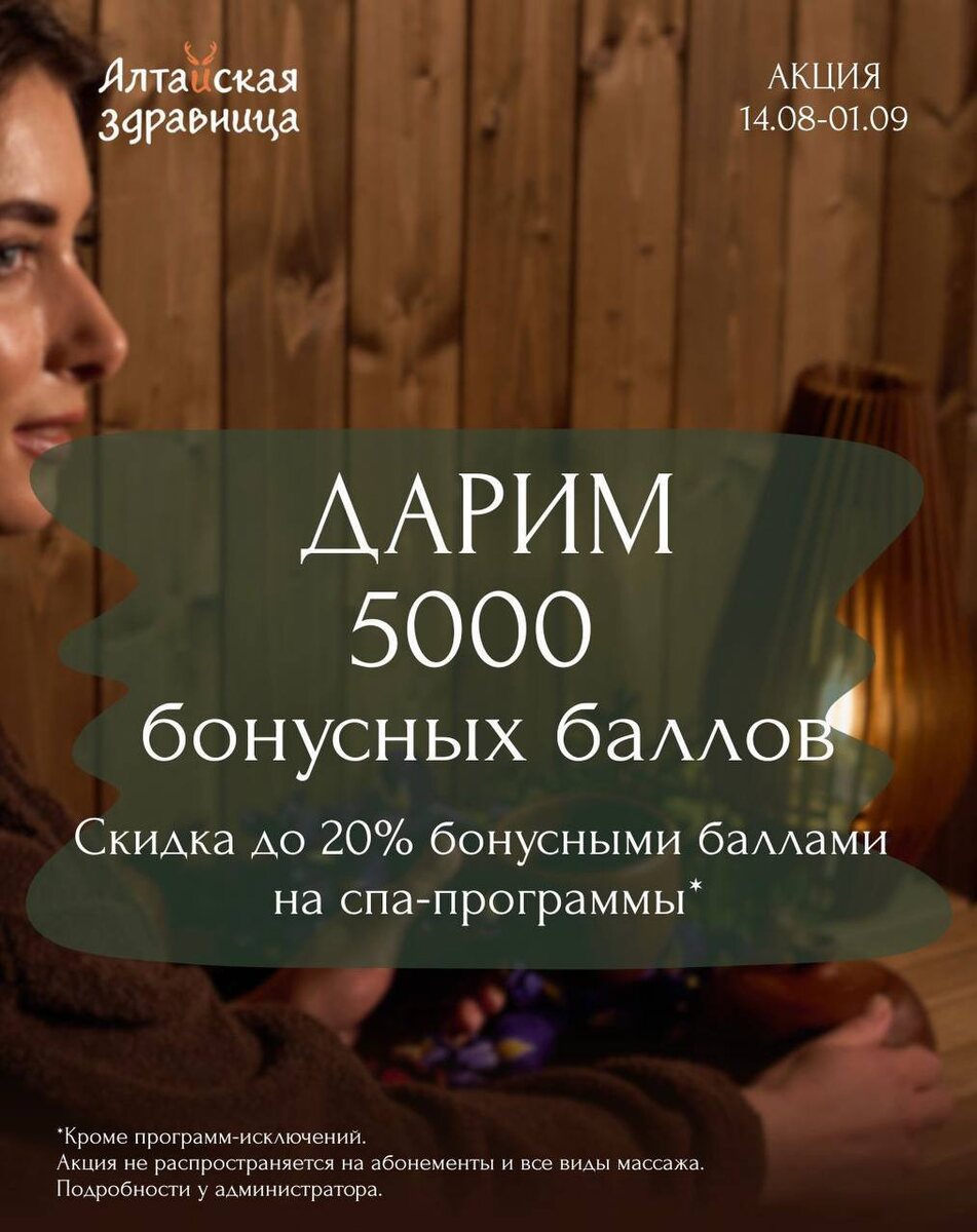 Позвольте себе отдых, о котором мечтали💆🏼♀️ В самом сердце Алтая есть место, где время течёт медленнее, а забота ощущается в каждом движении. Алтайская здравница — пространство тишины, тепла и восстановления сил. С 14.08 по 1.09 мы дарим особое внимание каждому гостю: 🌿 5000 бонусных баллов — всем участникам Программы лояльности и тем, кто зарегистрируется в этот период. Программа лояльности 👉🏻 https://app.samosale.ru/altajskaa-zdravnica/r-n-d-smm Оплачивайте бонусами до 20% стоимости СПА-программ* — и погружайтесь в мир расслабления с выгодой. Закройте глаза, вдохните аромат целебных трав… и почувствуйте, как усталость уходит, а тело наполняется лёгкостью. 📌 Подробности акции уточняйте у администратора.