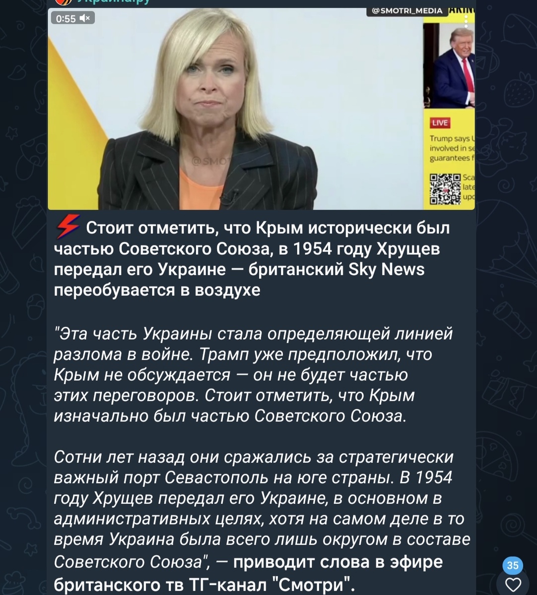 Британская Скай ньюс стала признавать факт передачи Крыма в состав Украины. Судя по этому Скрину из Телеграм, они признают что Крым был частью Советского Союза. И Хрущев передал в состав Украины. Какой хитрый информационный ход. В состав Советского Союза входил Крым и входила Украина как союзная республика. До 1954 года Крымская область, до этого Крымская Автономия входили в состав РСФСР. Перелечу территорий производили союзные республики, входившие в одно государство, СССР. Я не знаю намеренно так делают британские журналисты или они невежы. Скорее всего первое. Они намеренно искажают истину, представляя передачи территории внутри одной страны, как сделку между государствами. Они отделяют УССР от Советского Союза, называя просто Украиной. У потребителей британских новостей складываются определенное мнение, которое отличается от реальности.