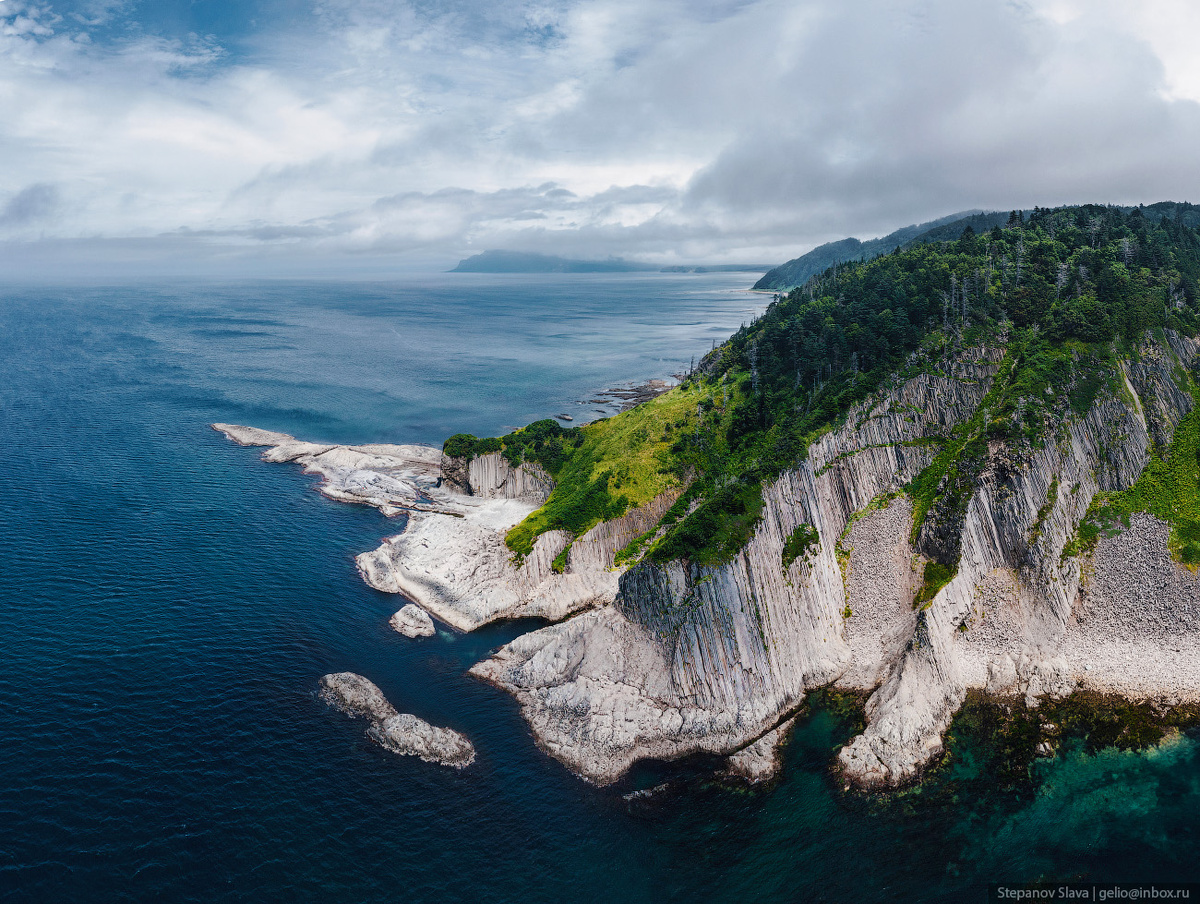 На западном побережье Кунашира скрывается одно из самых удивительных чудес Курил — мыс Столбчатый. Его скалы состоят из правильных базальтовых столбчатых призм и поднимаются на 40–50 метров над морем. Поперечная форма столбов — правильные пятигранники и шестигранники. На ровной горизонтальной поверхности это похоже на мостовую или шкуру огромной рыбы, сбоку — на кору огромного дерева.
