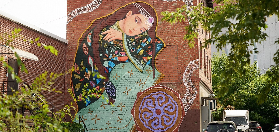 Там на стене нас ждет мурал — иллюстрация легенды про девушку Чару, душа которой превратилась в камень Чароит. Ее изобразили в одежде народов Сибири с национальными орнаментами. Бубен символизирует взаимосвязь с душой Чары и погружение в историю.