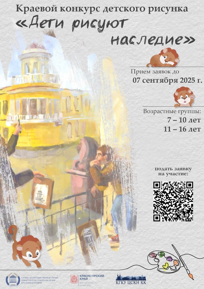 Служба по государственной охране объектов культурного наследия Красноярского края объявляет прием работ на ежегодный конкурс «Дети рисуют наследие» для детей и подростков, занимающихся изобразительным искусством в центрах детского творчества, изостудиях, детских школах искусств и иных творческих объединениях, находящихся на территории Красноярского края. Конкурс проводится совместно с Краевым государственным казенным учреждением «Центр по сохранению культурного наследия Красноярского края» при поддержке Министерства культуры Красноярского края. Приглашаем наших юных ценителей культурного наследия от 7 до 16 лет изобразить окружающие их объекты культурного наследия, расположенные на территории Красноярского края! Прием работ осуществляется с 25 февраля по 07 сентября 2025 года включительно. Подать заявку и ознакомиться с положением о конкурсе можно по ссылке: clck.ru/3Gb49P По окончании конкурса лучшие работы будут награждены призами и дипломами.